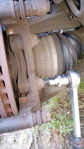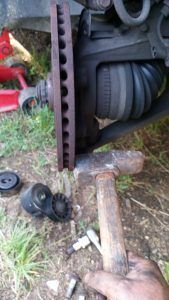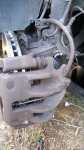 Etape n°3 : Repousser le piston à l’aide d’un gros tournevis entre la plaquette et le piston, sur l’intérieur du véhicule. Ensuite il faut lever l’étrier et débrancher les témoins d’usure.