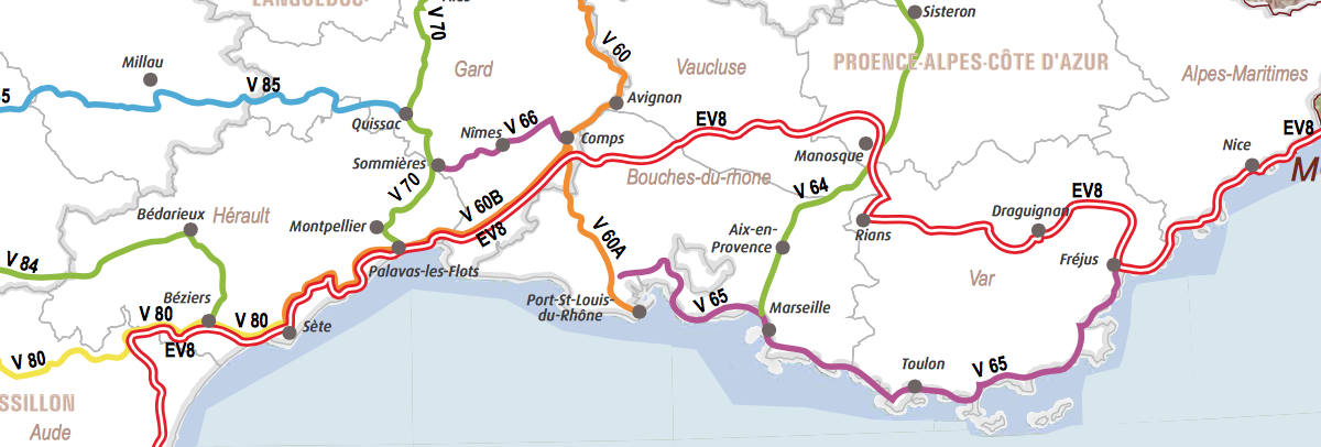 Cette piste cyclable azuréenne s’inscrit dans un projet d’aménagement, l’Eurovéloroute n°8, qui doit relier à terme Cadix à Athènes sur plus de 5 000 km, dont 670 en France. Je dois dire que l’on fait parti des bons élèves : http://www.departements-regions-cyclables.org/page/index.php?p=43&ref=74 . Car même si la réalisation n’est pas idéal, elle a le mérite d’exister.