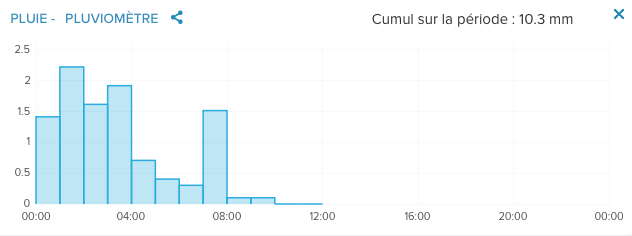 Enfin il pleut et je peux voir le bon fonctionnement de l’installation : A noter quand même que le niveau radio n’est pas vraiment stable pour une raison que j’ignore : Une heure après : Le nombre d’installation progresse : A suivre.