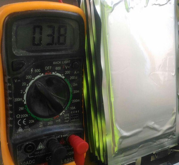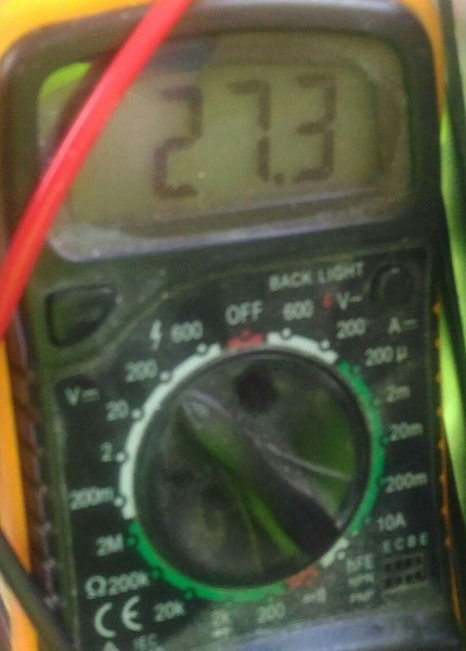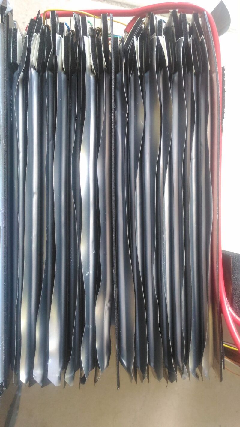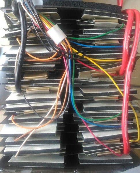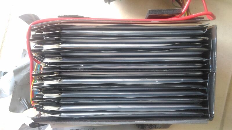 La batterie est composée d’un sandwich de batterie de 3,8V et de 10,41 Ah. Au total on a 27,3 V. Il y a 14 piles dans le sandwich et c’est divisé en deux sandwich de 7 piles plates normalement on devrait avoir 7x3,8V = 26,6V mais j’ai mesuré 27,3V.