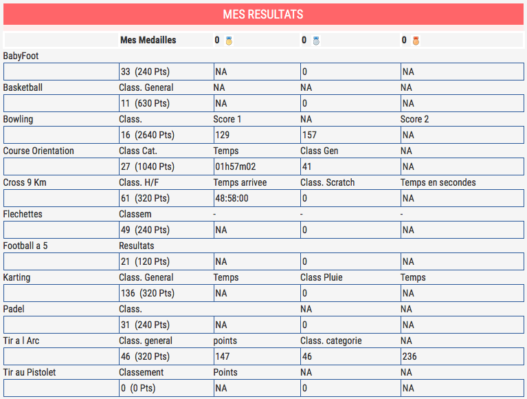 A noter que sur le bowling il y avait 109 hommes, 130 hommes sur le Tir à l’Arc, 76 hommes sur le Tir au pistolet, 73 hommes sur le VTT individuel, 94 hommes sur le Cross de 9km, 269 hommes sur le Karting.
