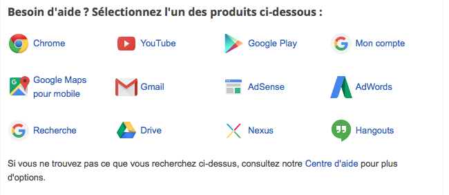 Google met à notre une disposition un contact sur les différents services: http://www.google.com/intl/FR_fr/contact/. Une fois que l’on est sur le lien, il faut cliquer sur l’onglet « centre d’aide » puis agrandir la liste des icônes.