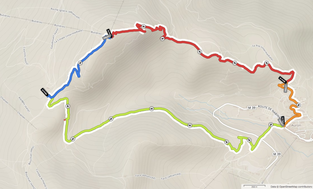 - en vert (4,32 km env.), c’est le retour à Auron par les pistes. On arrive donc au syndicat d’initiative.