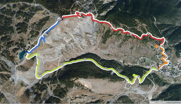 - en rouge (3,3 km env.), c’est l’ascension vers la cime de la Bercha.
