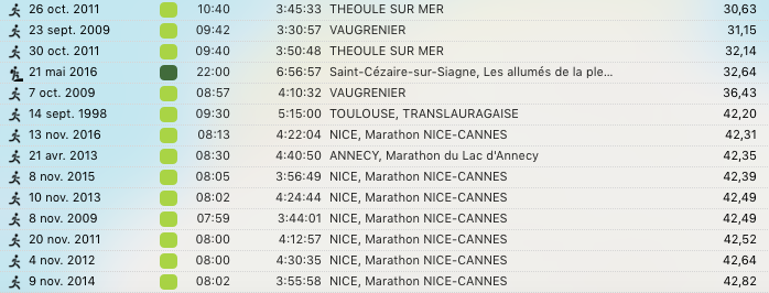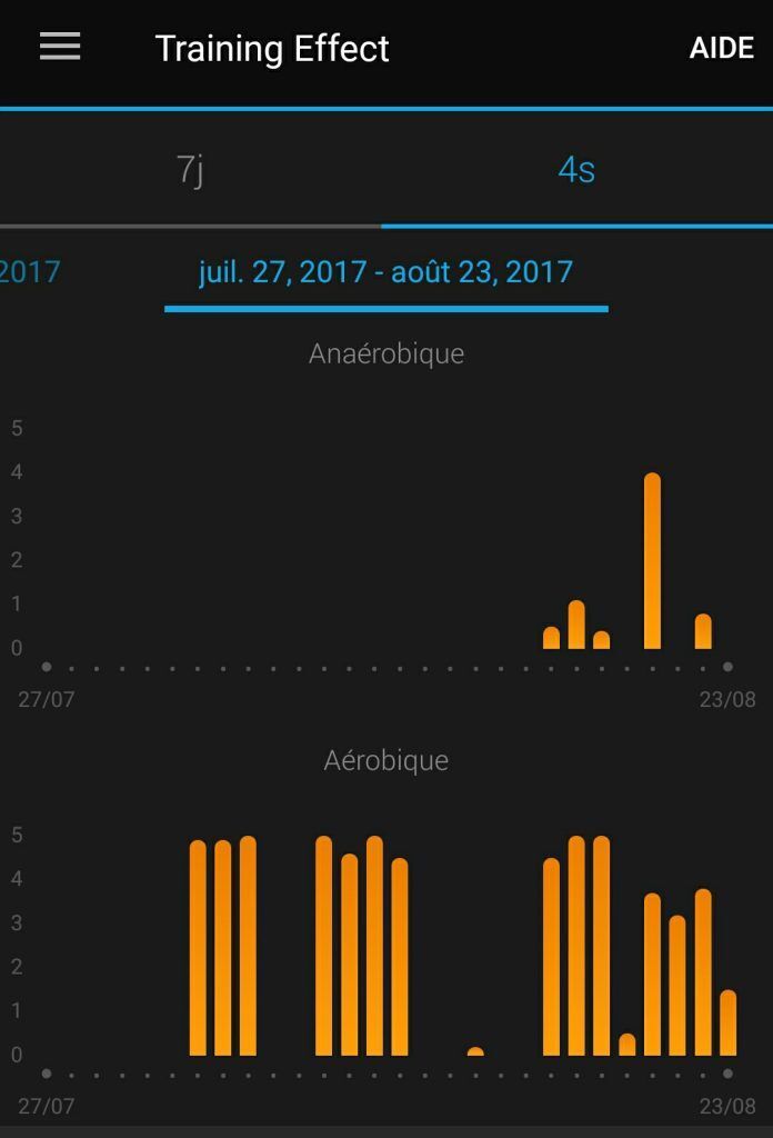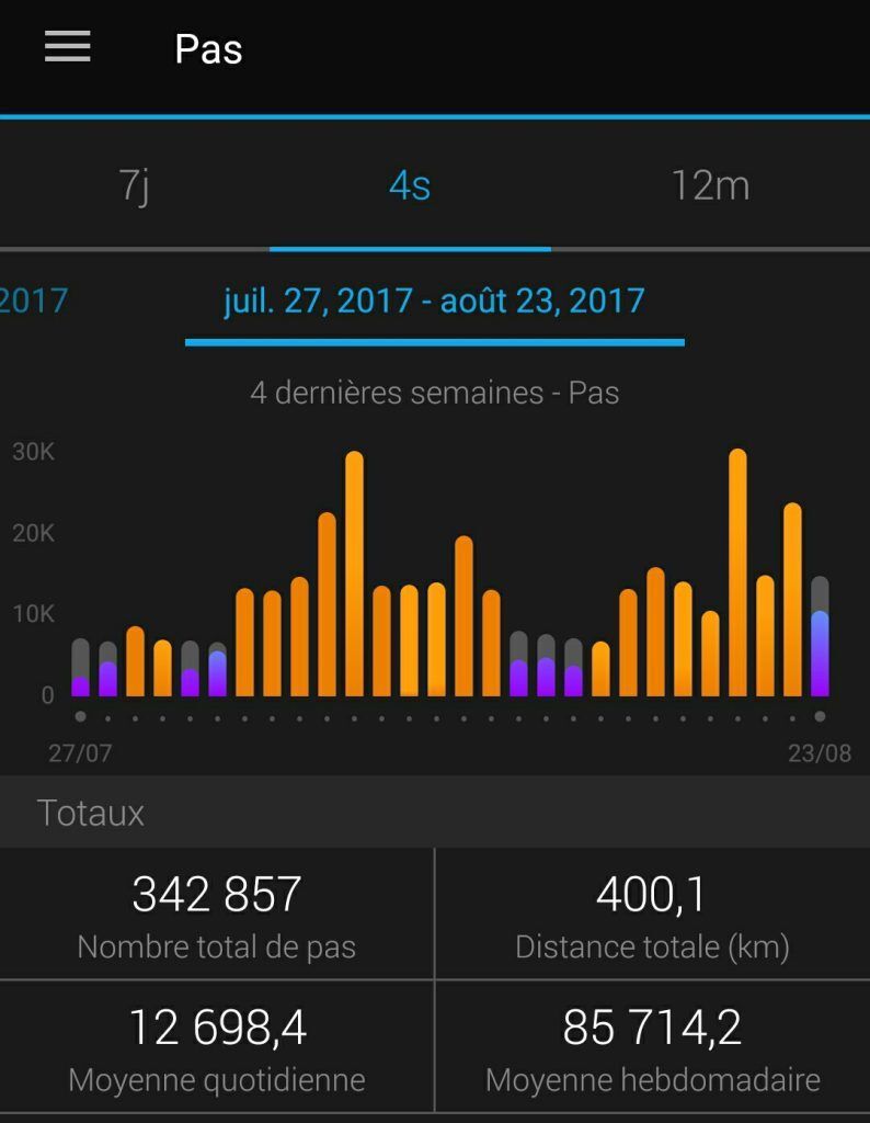 C’est donc le 1 août que je me suis inscrit au Trail de la Vésubie (prix : 55 Euros). Je me suis inscrit à ce Trail pour faire une préparation au Trail de Gorbio (prix : 22 Euros), dont j’avais fait l’inscription le 28 juin. Pour ce qui est de la préparation, j’ai fait des randonnées ( https://www.cyber-neurones.org/2017/08/randonnee-a-auron-cime-de-la-bercha-via-une-boucle/ & https://www.cyber-neurones.org/2017/08/balade-de-biot-a-valbonne-par-la-brague/ …) et du tapis de course incliné à 15%. Si je vais sur Garmin Connect, il m’indique 400,1 km sur les 4 dernières semaines :