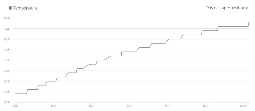 - Thermomètre pas fiable, je vais une session de 10 min dans un sauna et j’avais une température de 43°C (après 10 min, il a donc fallu 10 min pour passer de 27,5 à 43 ) … alors qu’il faisait entre 65°C et 70°C .