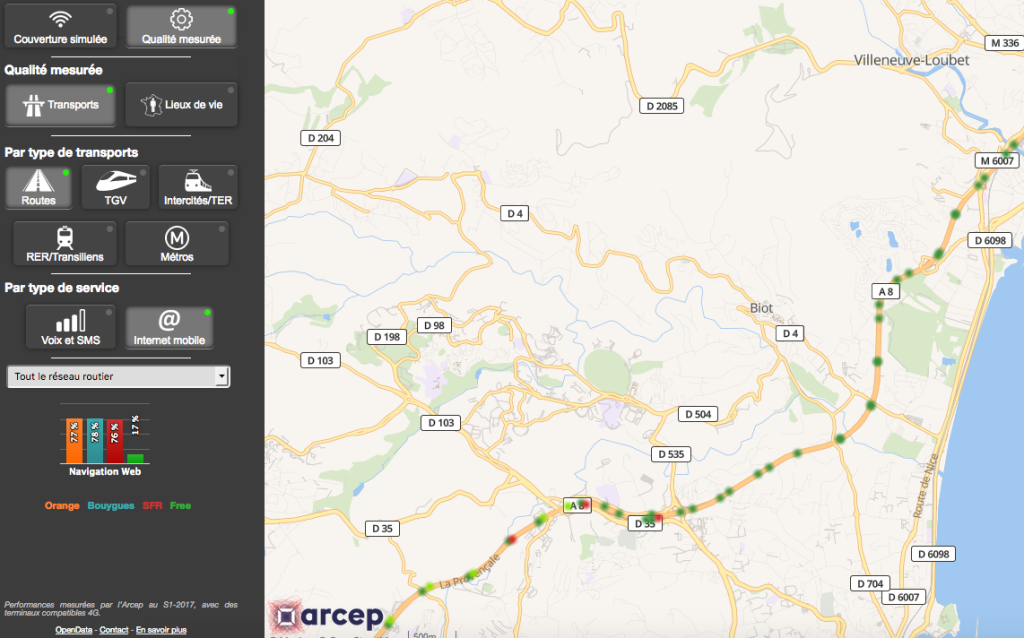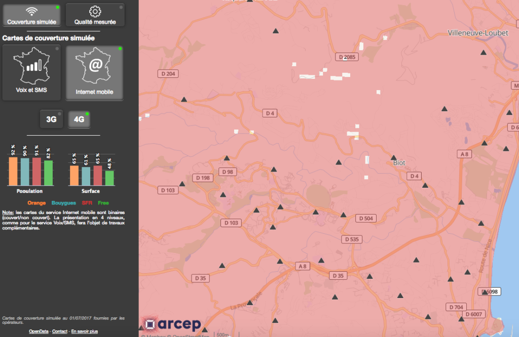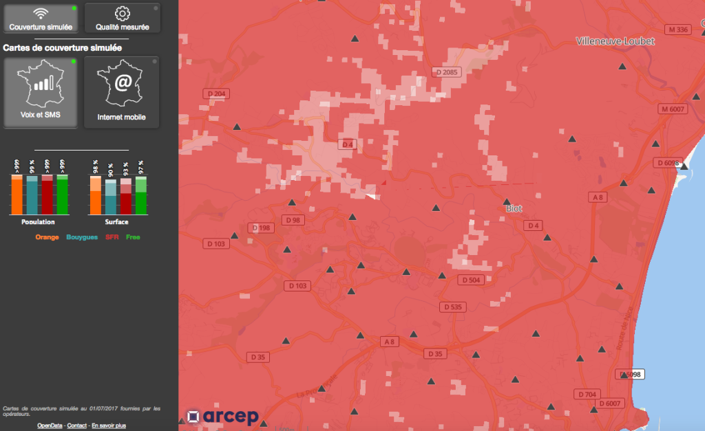 Enfin les données de l’ARCEP, sur la qualité du réseau mobile, sont disponibles : https://www.monreseaumobile.fr . ( Le site ne fonctionne pas avec Safari :( )