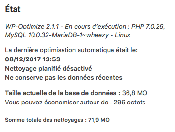 Bilan suppression de 71,9 Mo, énorme ! Incroyable et efficace … plus de 60% d’espace en base de donnée en moins.
