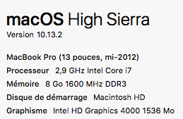 Mon OSX : Version 10.13.2 (17C88). ( A noter : Le MacBook est de mi-2012 et on est en 2017 … bonne espérance de vie. Pour rappel, la vrai date d’utilisation est dans Logiciel -> Installation )