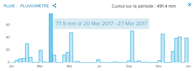 Voici les relevés avec Netatmo sur l’année 2017 : 491,4 mm dans l’année.