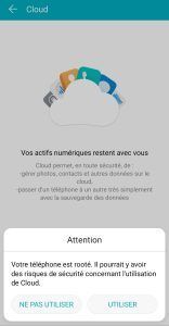 Voici par exemple un avertissement que j’ai : “Votre téléphone est rooté. Il pourrait y avoir des risque de sécurité concernant l’utilisation du Cloud”.