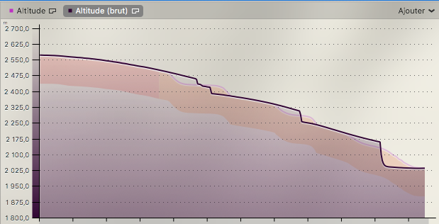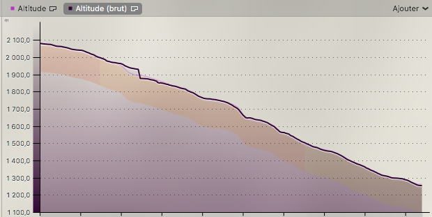 Ensuite je n’ai jamais eu de montée dans les statistiques, alors que par moment il fallait prendre de la vitesse pour remonté. Avec la Forerunner 920 je pouvais voir quand il y avait une montée sur la piste.
