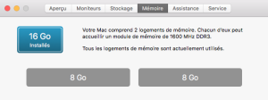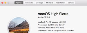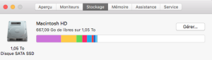 Mon portable MacBook Pro ( High Sierra ) et il a 16 Go de RAM et 1 To de disque dur en SSD :