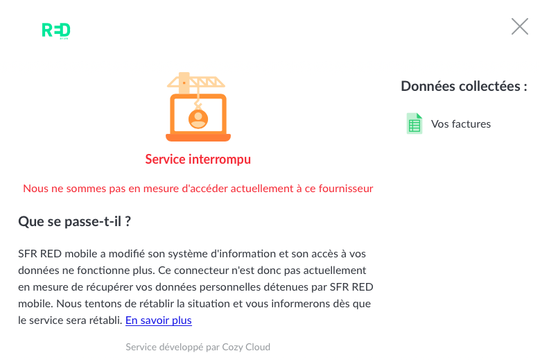 Cela est utile pour prévenir les Cozynautes de dysfonctionnements qui ne sont pas liés à Cozy, mais à des changements de leurs fournisseurs. Si cela vous gêne de ne pas pouvoir récupérer vos factures SFR, n’hésitez pas à leur signaler. Certains de nos utilisateurs le font régulièrement, par exemple ici : https://forum.sfr.fr/t5/Acc%C3%A9der-%C3%A0-mon-compte-SFR-identifiants/R%C3%A9cuperer-automatiquement-les-factures-via-cozycloud/m-p/2034069