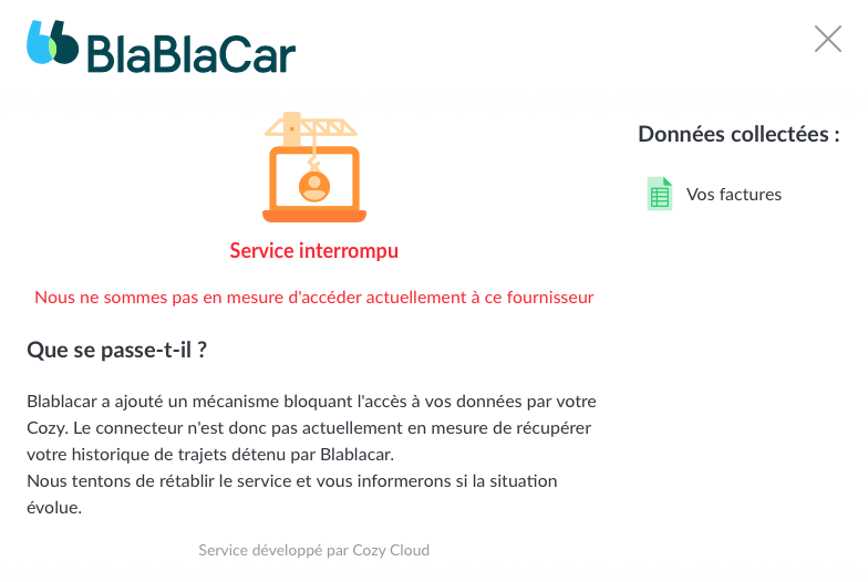 Certains fournisseurs sont actuellement en maintenance. C’est le cas par exemple pour RED, SFR ou Blablacar : ces connecteurs fonctionnaient, mais les services ont ajouté des « Captchas » pour bloquer nos connecteurs. Nous cherchons actuellement des solutions de contournement. À chaque fois qu’un site évolue, nous devons adapter le connecteur pour prendre en charge ces évolution, et il est donc mis en maintenance temporaire. C’est le cas par exemple en ce moment du Crédit Coopératif, dont le site vient de changer.