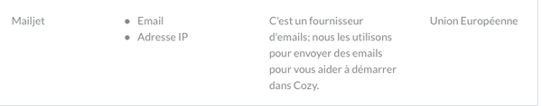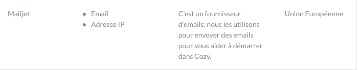 Nous utilisons Postmark pour les emails transactionnel (validation de la création du compte, rappel du mot de passe, etc). Nous utilisons Mailjet pour des emails qui ne sont justement pas transactionnel mais importants pour le service, comme le mail de mise à jour des CGUs et ceux pour vous aider à utiliser Cozy par exemple. Nous avons besoin d’utiliser ce type de prestataire pour nous assurer que les emails arrivent bien, nous ne souhaitons pas prendre le risque d’être placé en spam.
