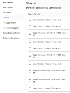 Depuis le début je demande une interface pour voir les connections avec : OS / IP / Date / Heure de connexion. Enfin Digiposte prend en compte cette demande, à 75% car il manque l’IP.