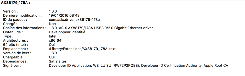 Quand j’ouvre une console et que je tape : “kextstat | grep com.asix” , le driver n’est pas visible.