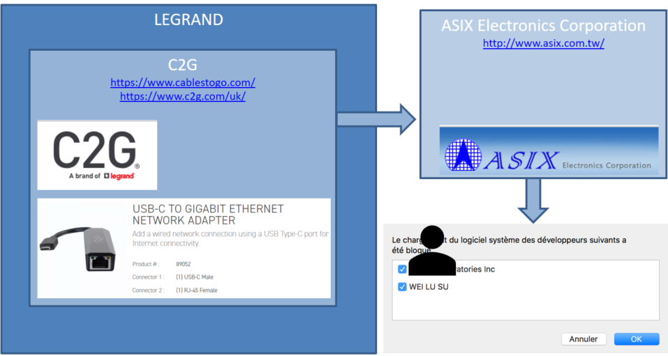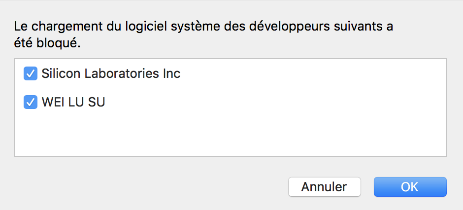 - SOLUTION : J’ai autorisé le développeur “WEI LU SU”, et j’ai relancé le Mac … et cela a fonctionné. C’est très professionnel de mettre le nom du développeur….