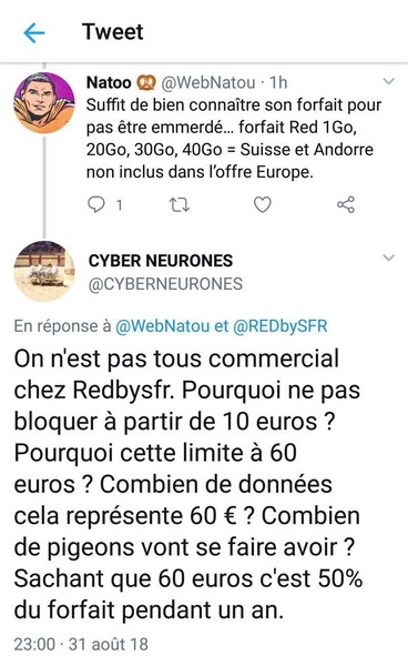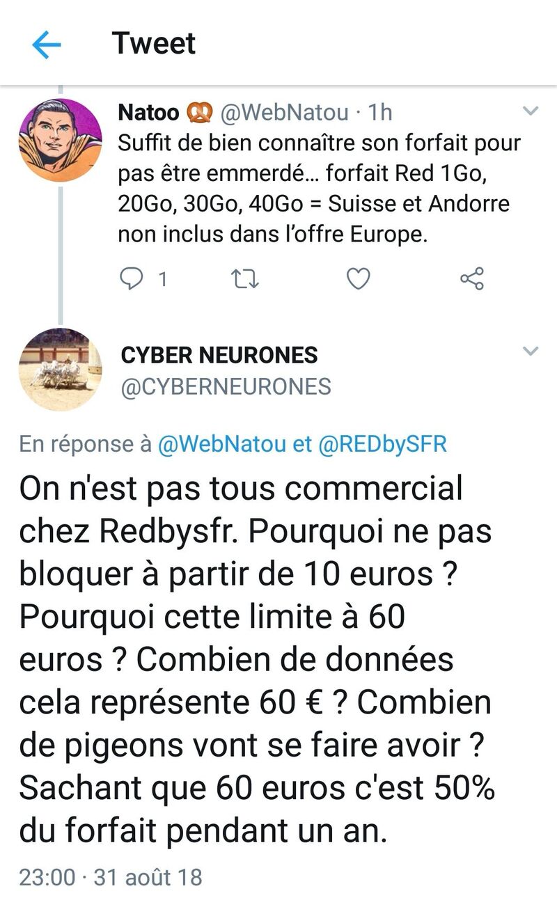 Avec RedBySFR le diable est dans les détails, enfin en Suisse … combien vont se faire plumer de 45 Euros ou 60 Euros? J’ai une pensée pour les personnes en transit en Suisse, voire même pour les frontaliers … pour mon cas c’est plutôt exceptionnel. J’ai aussi une petite pensée pour les personnes qui vont en Andorre et qui vont repartir le coffre plein pour faire de petites économies. Pendant ce temps RedBySFR aura fait un gros bénéfice … Je lance le hashtag : #LeDiableEstDansLesDetailsOuEnSuisse.