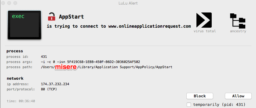 Normalement je devrait avoir une fichier : ~/Library/LaunchAgents/com.onlineapplicationrequest.* … Peut-être que Lulu a supprimé le fichier.