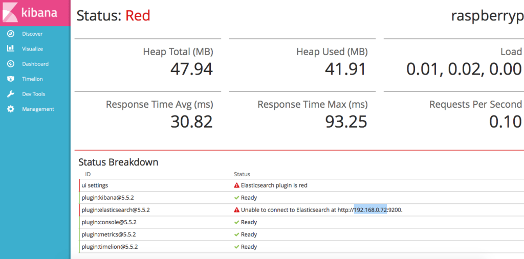 | RASP4 | a020d3 | ARMv7 Processor rev 4 (v7l) | 949452 | 4.14.50-v7+ | 192.168.0.72 | Elasticsearch | OK |