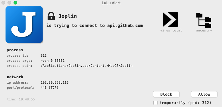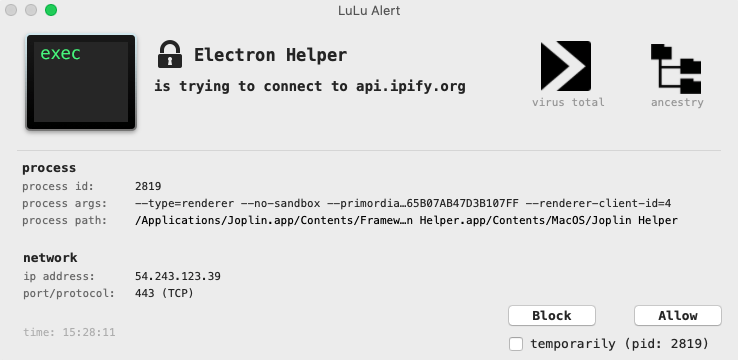 Quand je prend la première note, aie …. une requête vers api.ipify.org sur le port 443