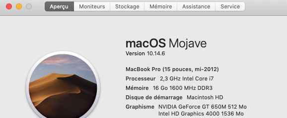 Nouveau test de charge cette fois avec un MacBook Pro (15 pouces, mi-2012) : Mojave 10.14.6 / 2,3 GHz Intel Core i7 / 16 Go 1600 MHz DDR3 / NVIDIA GeForce GT 650M 512 Mo / Intel HD Graphics 4000 1536 Mo . C’est pour faire suite à ce premier test : https://www.cyber-neurones.org/2019/12/macos-macbook-pro-15-inch-2017-benchmark-avec-blender/ : Catalina 10.15.1 (19B88) / MacBook Pro (15-inch, 2017) / 2,9 GHz Intel Core i7 quatre cœurs / 16 Go 2133 MHz LPDDR3. Entre les deux portables il y a 5 ans d’anciennetés .