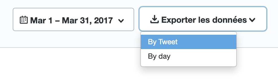 Je vais sur Twitter Analytics : https://analytics.twitter.com/about et je télécharge les fichiers CSV (By Tweet, et non By Day). Normalement j’ai un fichier CSV par mois.