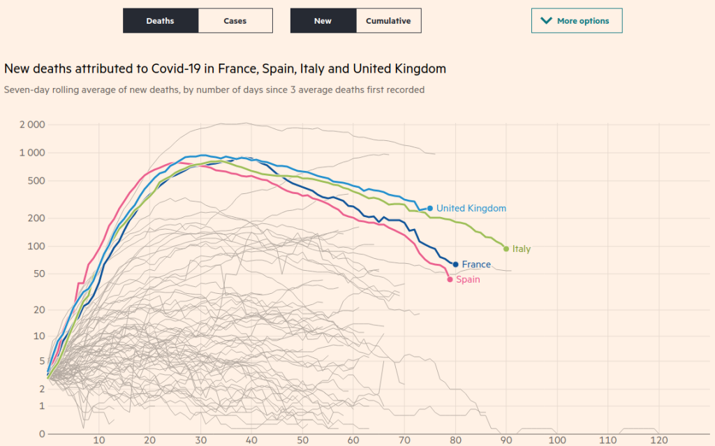 Je vous conseille le site : https://ig.ft.com/coronavirus-chart/ . Par exemple avec les filtres suivants: https://ig.ft.com/coronavirus-chart/?areas=fra&areas=esp&areas=ita&areas=gbr&areasRegional=usny&areasRegional=usnj&cumulative=0&logScale=1&perMillion=0&values=deaths .