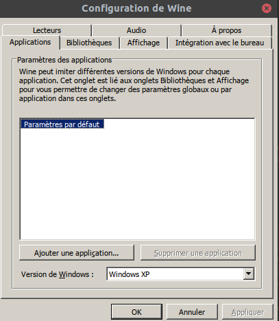 Bref c’est pas le top. J’ai donc lancé winecfg pour modifier et passer de Windows 7 à Windows XP.