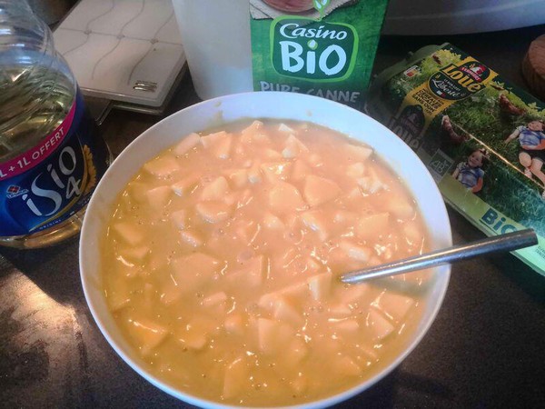 On mélange tout à l’aide d’une fourchette puis on ajoute les pommes en cube au fur et à mesure.