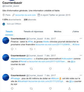 A noter que “Le Courrier du soir” c’est un ancien titre de journal (1914-1917) . http://presselocaleancienne.bnf.fr/ark:/12148/cb41482770j En gros on est dans le même concept que “France Soir”, on utilise un ancien titre … pour propager des fausses informations.