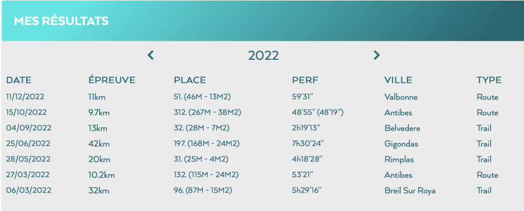 Même la FFA a plus de résultat que l’ITRA … c’est pour dire. Par contre l’interface est simplement nulle (pas d’affichage du D+, pas de graphique d’évolution).