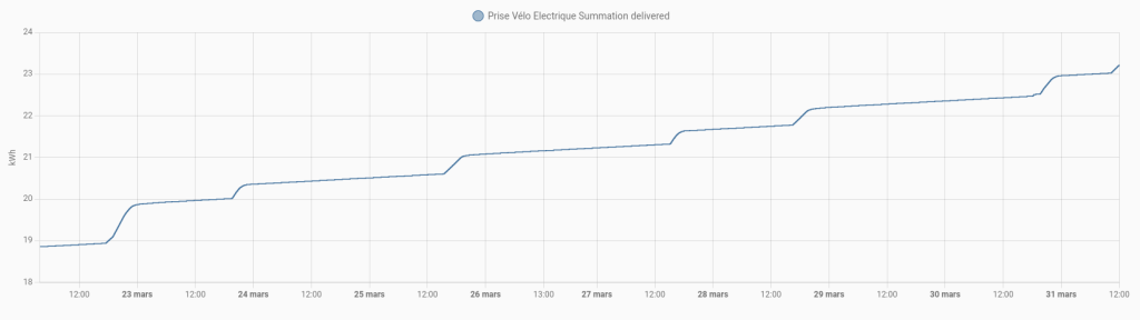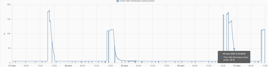 Voici la courbe via Home Assistant, on voit que les chargeurs consomment même sans les vélos :